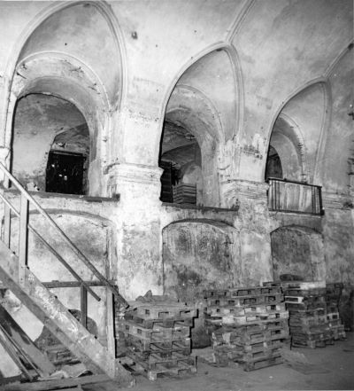 Pohled vzhůru odhalí barokní štukovou výzdobu stropu s třemi okny. Dvě krajní okna zobrazují noční oblohu s hvězdami, prostřední symbolizuje zapadající slunce – moment, kdy podle židovské tradice začíná nový den.