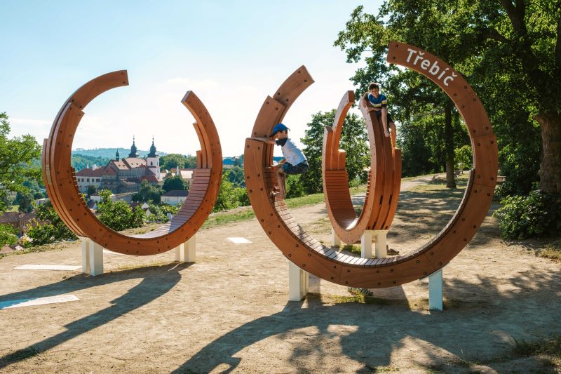 Moderní fotopoint ve tvaru tří dřevěných kruhů slouží nejen jako rámeček na fotografie, ale také jako místo k posezení nebo hraní. Pokud zvolíte správný úhel, zachytíte v kruzích siluetu centra Třebíče – ideální na památku nebo pro sociální sítě.