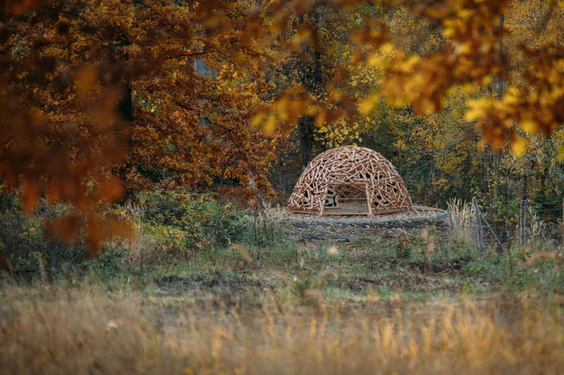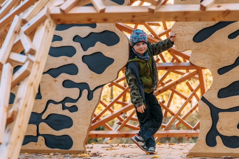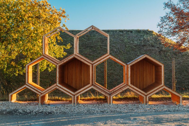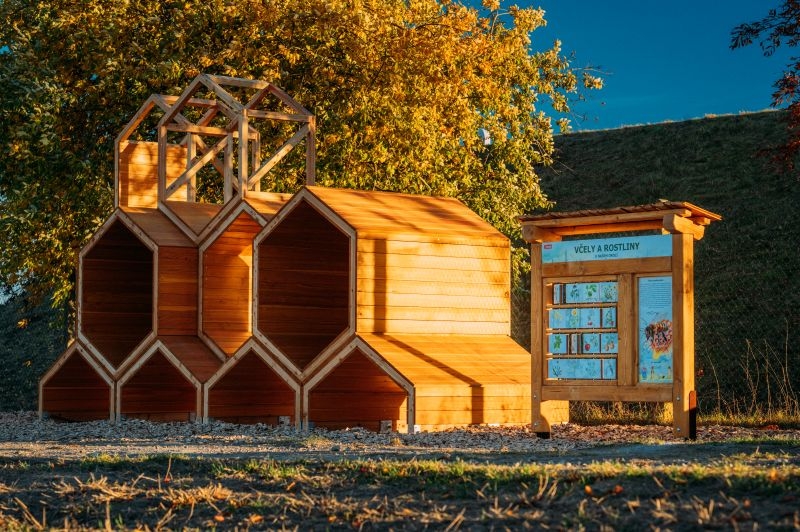 Velká dřevěná plástev vyrobená z modřínu, kterou mohou děti prolézat ze všech stran a prozkoumat, jak funguje život ve včelím úlu.