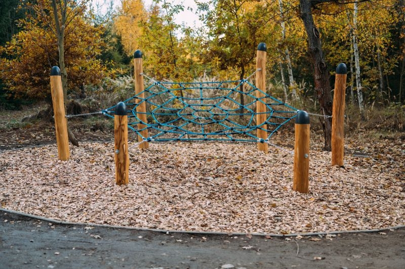 Lanová pavučina natažená mezi šesti jedlovými sloupy. Ideální pro malé pavoučí lezce. Děti se dozví, jaké pavouky mohou potkat v našem lese.