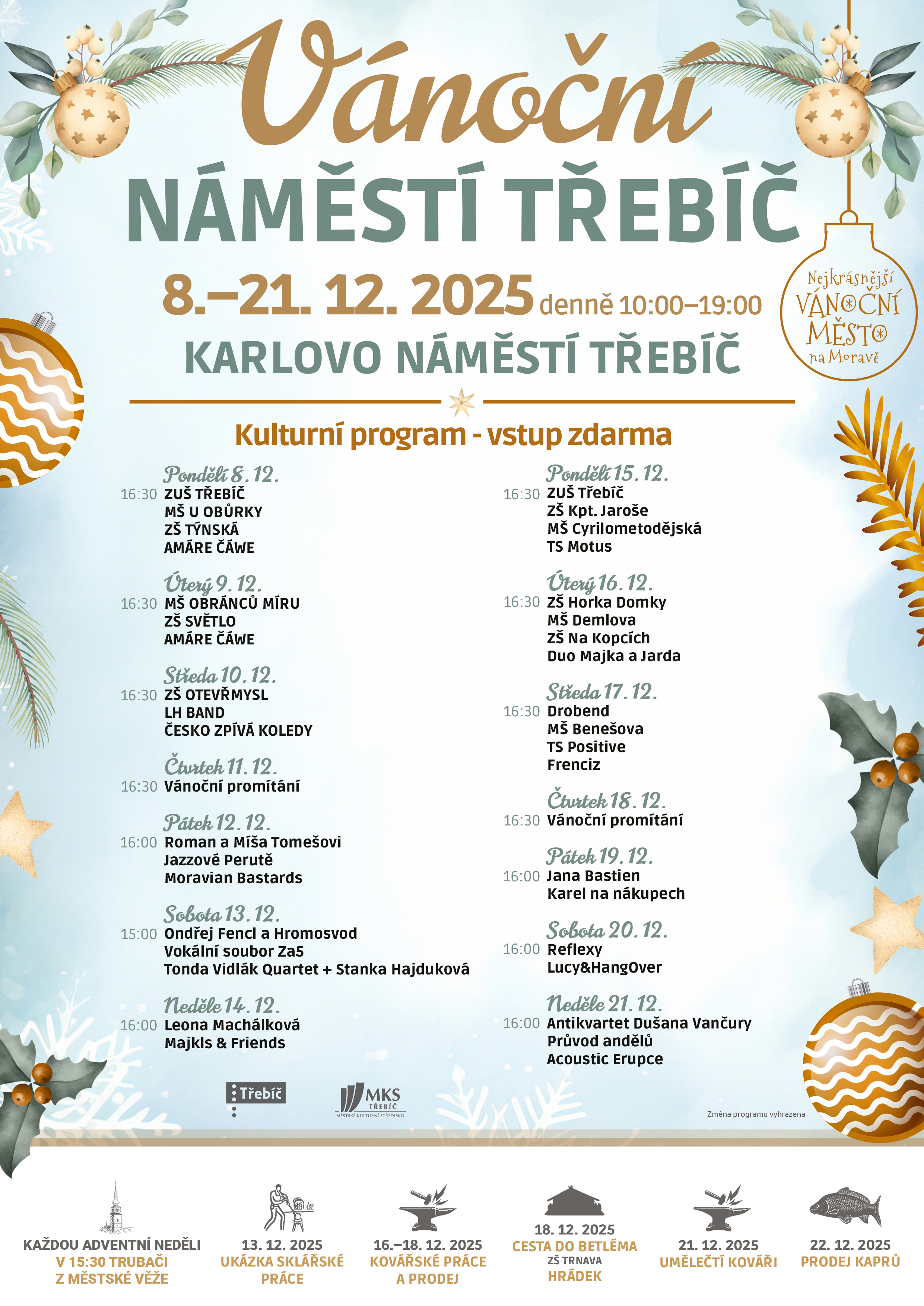 Těšte se na hudbu, tanec i svět plný světýlek. Od 8. do 21. prosince vás na vánočním náměstí v Třebíči čeká pestrý program pro děti i dospělé a každý den bude na náměstí znít jiný příběh – dětský smích, rytmy kapel, kouzlo vánočních melodií i krásné okamžiky, které patří k adventu: