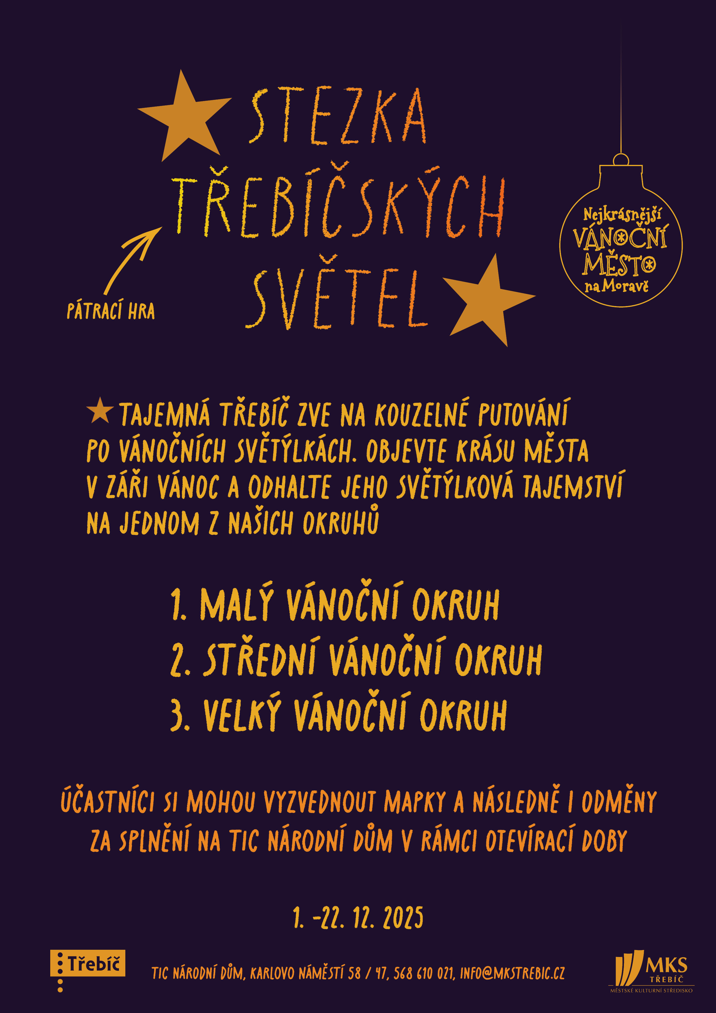 Vánoční Třebíč letos znovu rozzáří světelné objekty, které promění město v jemně svítící adventní krajinu. Od 1. do 22. prosince si můžete v Turistickém informačním centru v Národním domě vyzvednout speciální mapku a vydat se na Stezku třebíčských světel — zábavnou pátrací hru pro rodiny, děti i všechny, kdo mají chuť zpomalit a vychutnat si kouzlo zimních večerů.
