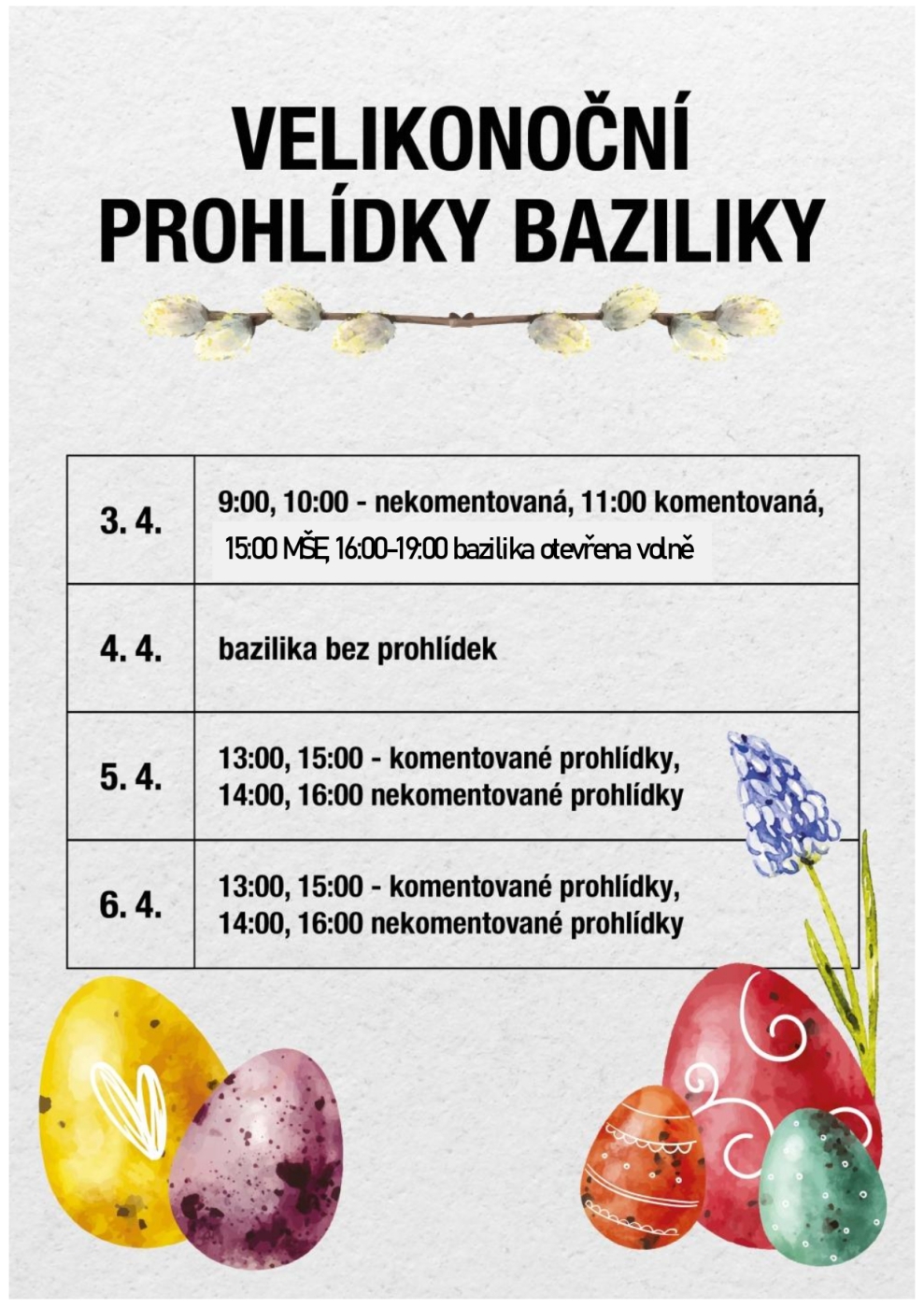 Minimální počet osob pro konání komentované prohlídky jsou 2. Nekomentované prohlídky hlavní lodi baziliky (80 Kč) je možné rezervovat předem i domluvit na místě. Vždy je nutné ověřit dostupnost na TIC Bazilika. Církevní obřady a komentované prohlídky mají vždy přednost. Nabídka sobotních nekomentovaných prohlídek baziliky v 10:00 a v 11:00. Jejich konání bude v závislosti na církevních obřadech a informace o jejich uskutečnění budeme zveřejňovat maximálně 5 dní dopředu. Dostupnost je nutné vždy ověřit na TIC Bazilika.